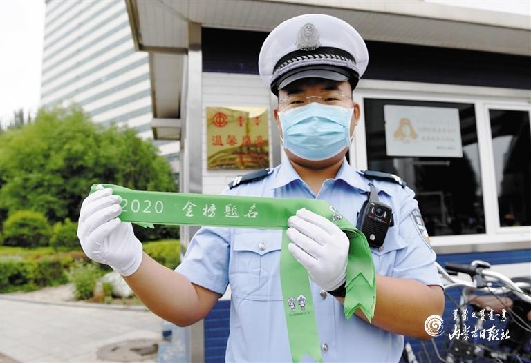 7月5日,呼和浩特市交警支隊賽罕大隊二中隊民警正在展示綠絲帶。為確保接送考生的車輛不被堵在路上影響考試,呼市交管支隊制作了25000條綠絲帶,家長或考生可以去市區(qū)考場附近的交警崗?fù)っ赓M(fèi)領(lǐng)取,“綠絲帶”要掛在機(jī)動車左側(cè)的后視鏡上。(內(nèi)蒙古日報記者 孟和朝魯 攝)