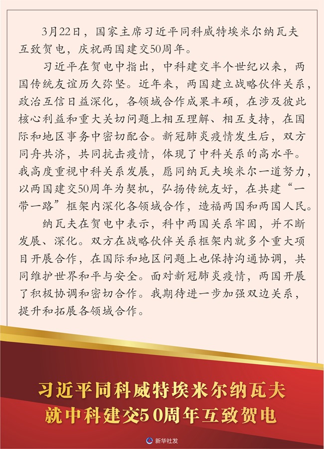 習(xí)近平在賀電中指出,中科建交半個世紀(jì)以來,兩國傳統(tǒng)友誼歷久彌堅。近年來,兩國建立戰(zhàn)略伙伴關(guān)系,政治互信日益深化,各領(lǐng)域合作成果豐碩,在涉及彼此核心利益和重大關(guān)切問題上相互理解、相互支持,在國際和地區(qū)事務(wù)中密切配合。新冠肺炎疫情發(fā)生后,雙方同舟共濟,共同抗擊疫情,體現(xiàn)了中科關(guān)系的高水平。我高度重視中科關(guān)系發(fā)展,愿同納瓦夫埃米爾一道努力,以兩國建交50周年為契機,弘揚傳統(tǒng)友好,在共建“一帶一路”框架內(nèi)深化各領(lǐng)域合作,造福兩國和兩國人民。