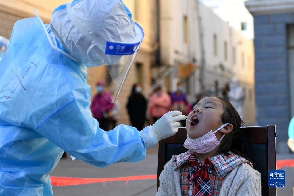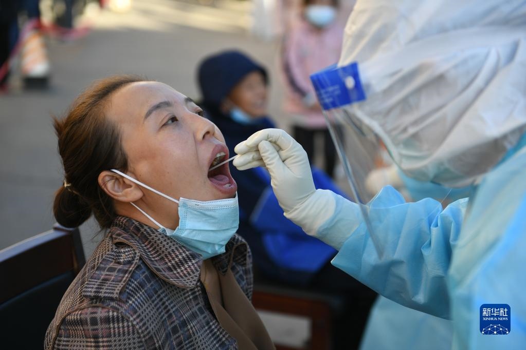10月20日,在因疫情封控的阿拉善盟額濟納旗達來呼布鎮(zhèn)天賦佳苑小區(qū)內(nèi),醫(yī)務人員為居民進行核酸采樣。新華社記者 貝赫 攝