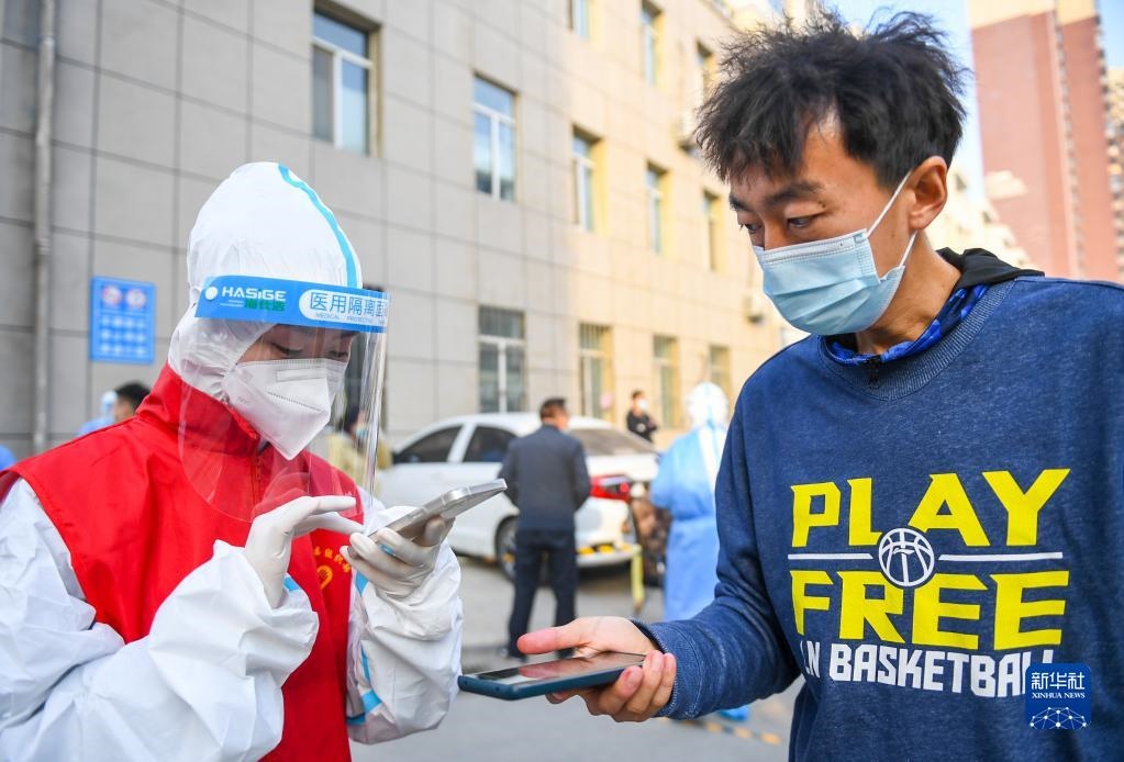 10月25日,在呼和浩特市賽罕區(qū)昭烏達南路街道惠民社區(qū)核酸檢測點,志愿者為居民掃碼登記信息。
