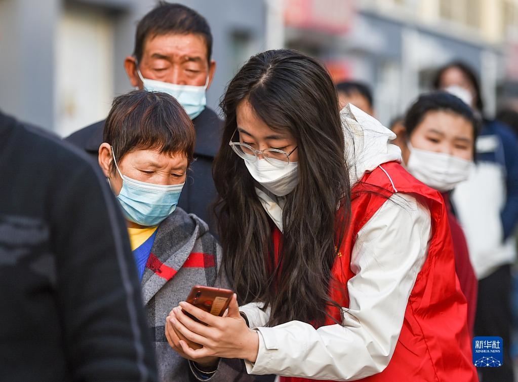 10月25日,在呼和浩特市賽罕區(qū)昭烏達南路街道惠民社區(qū)核酸檢測點,志愿者幫助居民用手機登記個人信息。