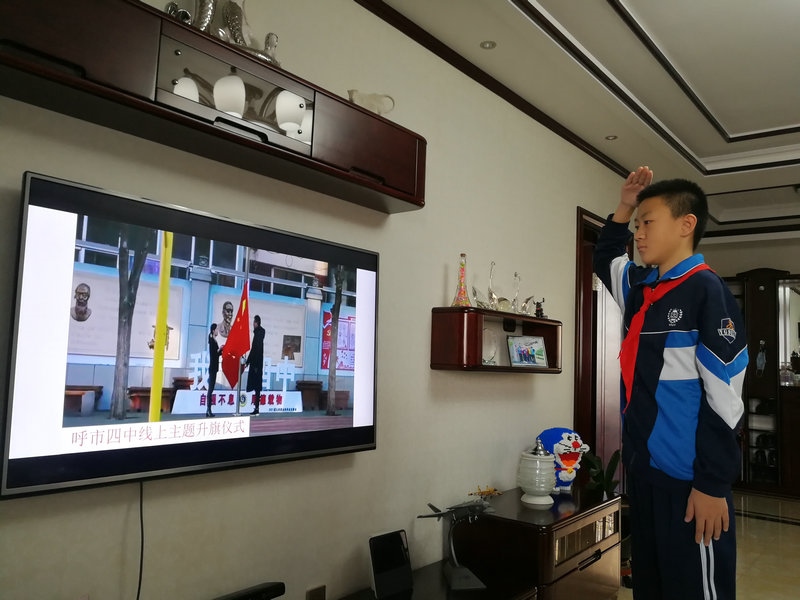 伴隨著激昂的《義勇軍進(jìn)行曲》,中小學(xué)生肅立屏幕前,看著冉冉升起的五星紅旗,高唱國歌,行隊禮,表達(dá)對偉大祖國的無限熱愛和崇高敬意。