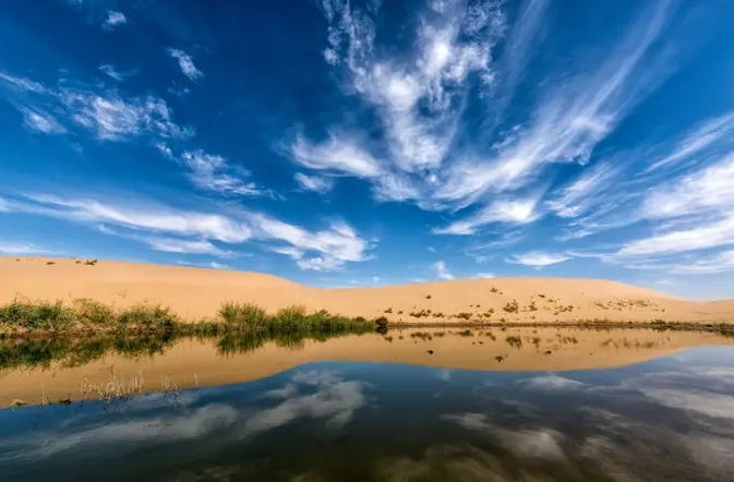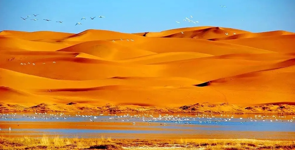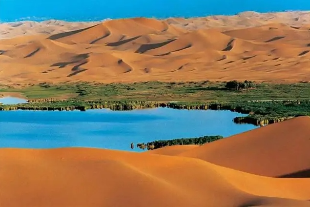 巴丹吉林沙漠年降水量不足40毫米,但是沙漠中的湖泊竟然多達100多個。高聳入云的沙山,神秘莫測的鳴沙,靜謐的湖泊、濕地,構成了巴丹吉林沙漠獨特的迷人景觀,于2005年被《中國國家地理》雜志評為中國最美麗的沙漠,每年吸引了上萬名國內外游客前來觀光。