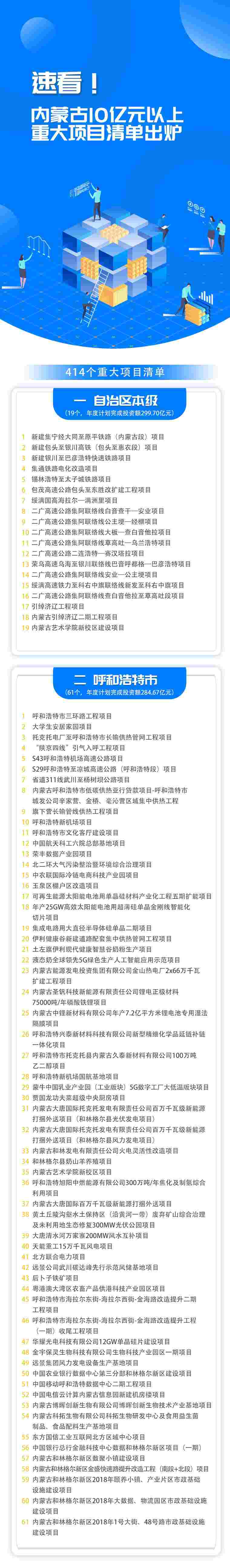 分盟市看,呼和浩特市計劃實施項目61個,包頭市60個,呼倫貝爾市15個,興安盟20個,通遼市23個,赤峰市25個,錫林郭勒盟20個,烏蘭察布市42個,鄂爾多斯市69個,巴彥淖爾市19個,烏海市20個,阿拉善盟21個。