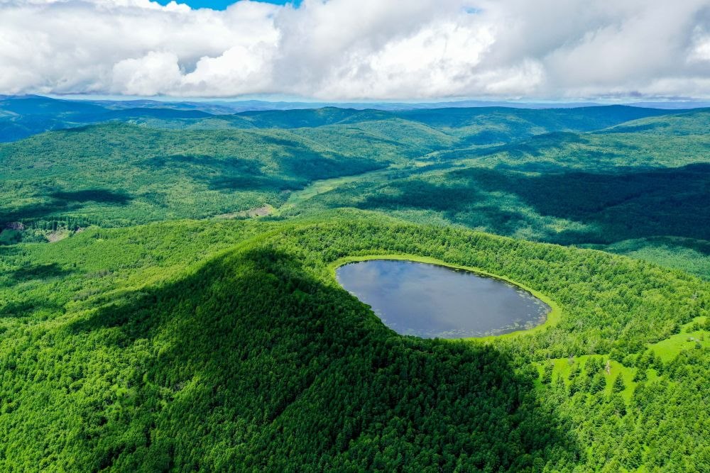 這是內(nèi)蒙古阿爾山天池風(fēng)光(2021年7月14日攝,無人機(jī)照片)。新華社記者連振攝