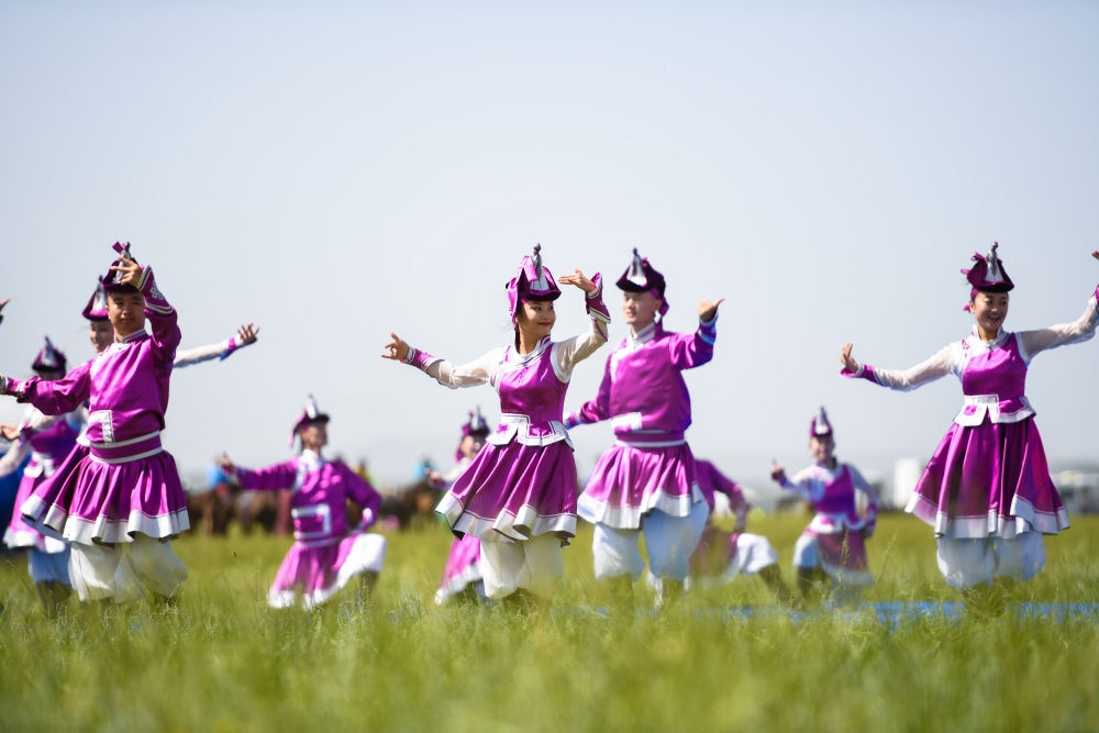 表演者在錫林浩特市游牧文化節(jié)·白音錫勒牧場建場70周年那達(dá)慕開幕式上表演傳統(tǒng)舞蹈(2020年8月2日攝)。新華社記者彭源攝