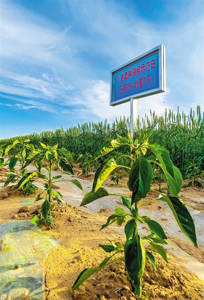 在示范園區(qū)小麥套種辣椒試驗田,目之所及,一排排結滿麥穗的小麥和長勢正旺的辣椒錯落有致,生機盎然。