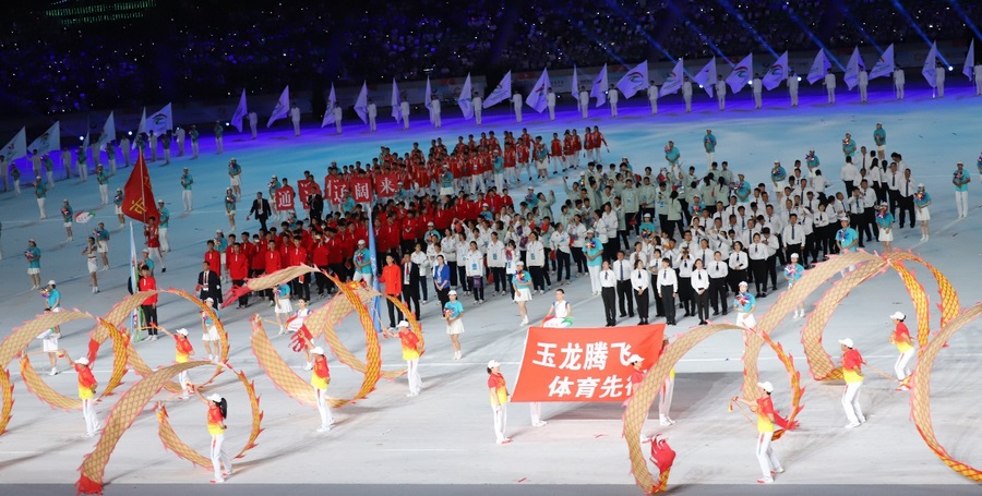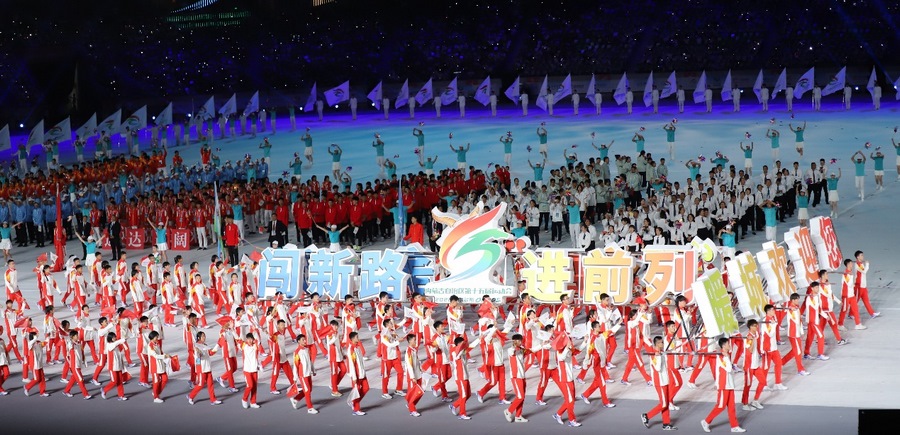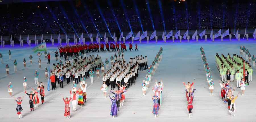 開幕式現(xiàn)場座無虛席,萬眾矚目下儀仗隊護送五星紅旗步入會場,國旗莊嚴,腳步鏗鏘,一種豪邁和驕傲激蕩在每個人的心里。