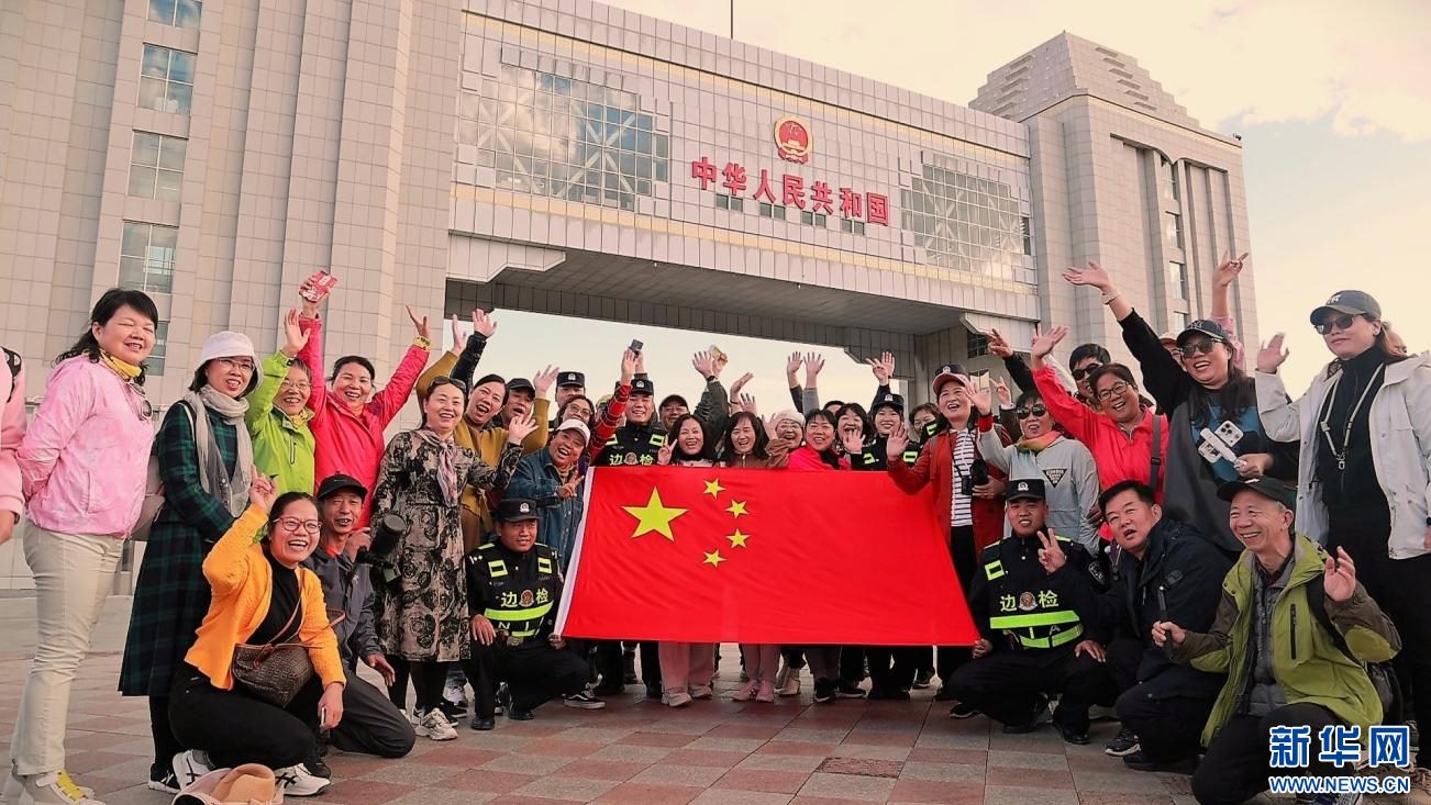 游客在滿洲里國門下合影。新華網(wǎng)發(fā) (李新軍 攝)