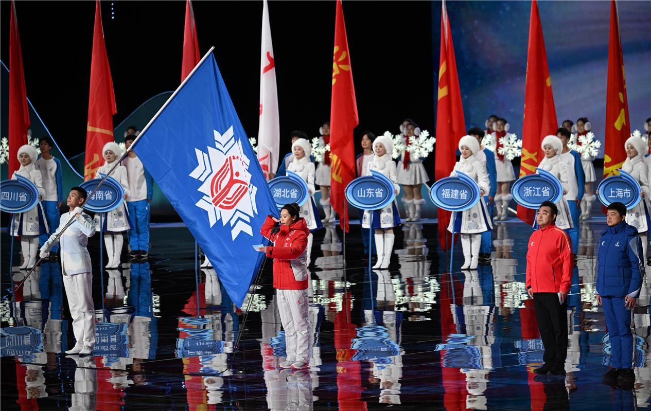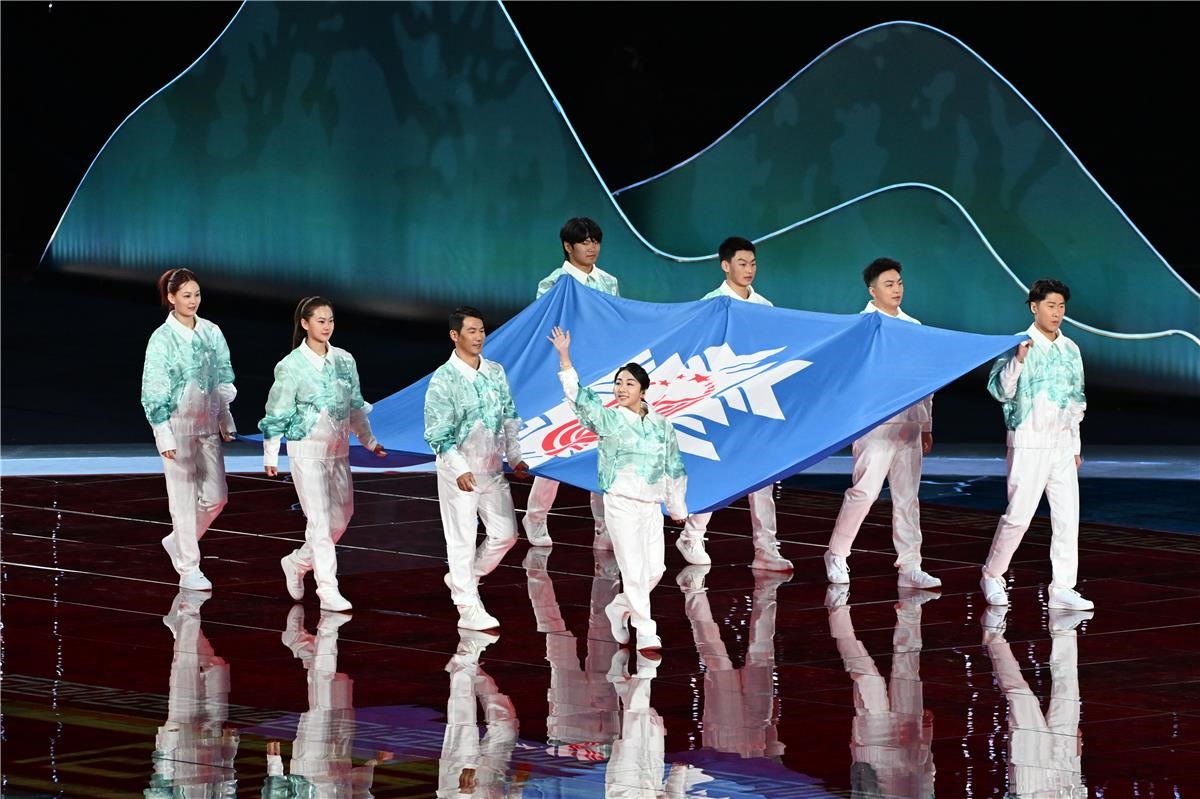 中華人民共和國第十四屆冬季運(yùn)動(dòng)會(huì)會(huì)旗入場。
