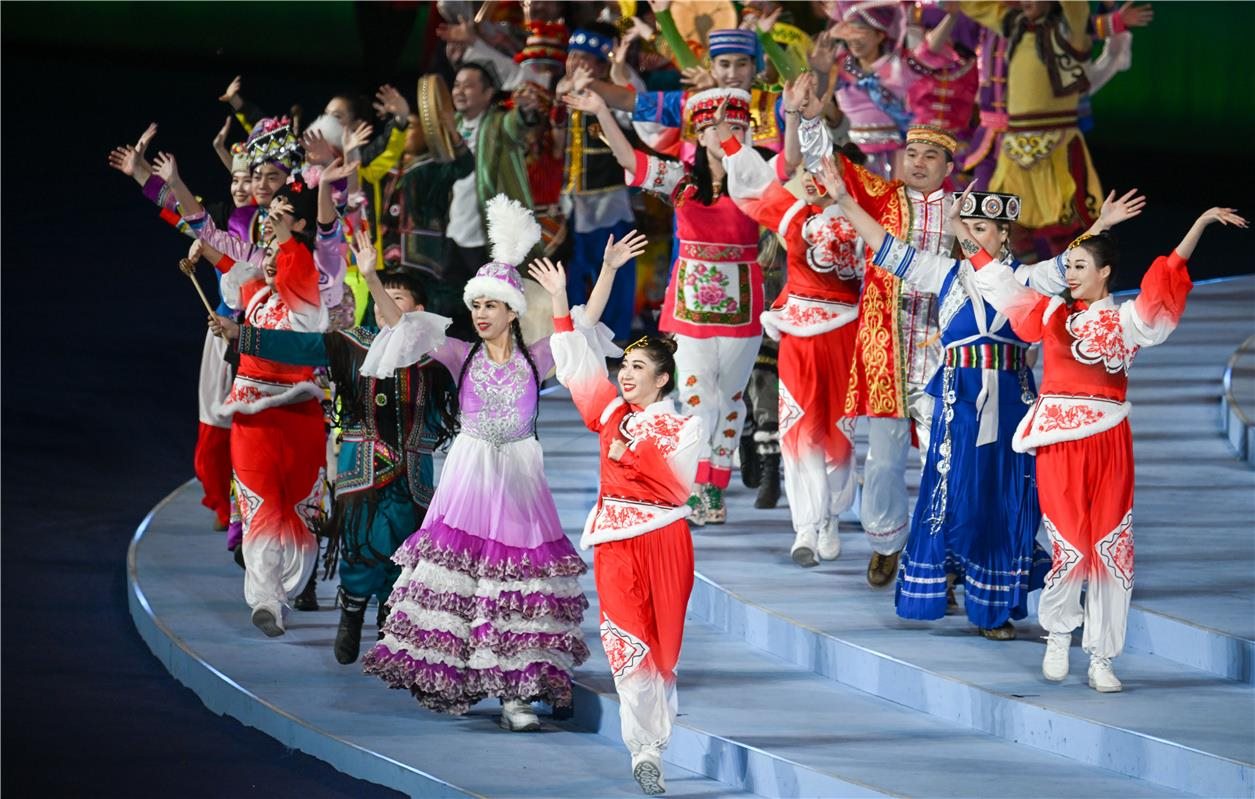 其中文體展演包括序篇《共同的家園》、主篇章《山河共錦繡》《冰雪共相約》《攜手共奮進(jìn)》和尾聲《共同的未來》,展演將中國風(fēng)范、民族特色、北疆韻味、運(yùn)動(dòng)活力通過科技手段創(chuàng)意呈現(xiàn),在傳承與創(chuàng)新的碰撞下,展現(xiàn)了草原文化、冰雪文化和民族文化的多彩魅力。