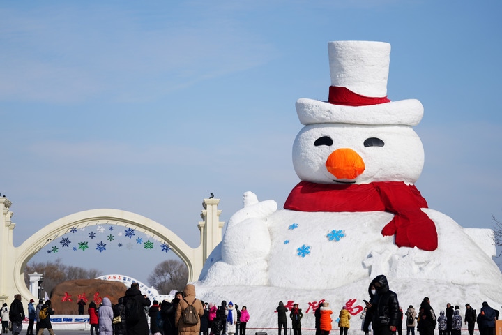 2月24日,在哈爾濱太陽(yáng)島雪博會(huì)園區(qū)門口,游客在大雪人前留影。新華社記者王建威攝