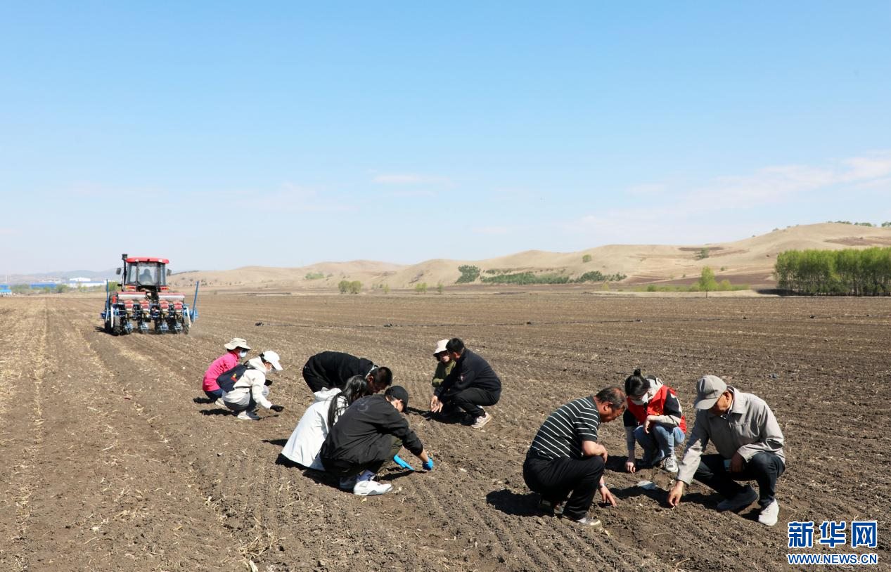 ??5月7日,在內(nèi)蒙古自治區(qū)扎蘭屯大豆科技小院,內(nèi)蒙古農(nóng)業(yè)大學(xué)研究生在大河灣鎮(zhèn)尖山子村試驗田播種大豆。新華網(wǎng)發(fā)(韓冷 攝)