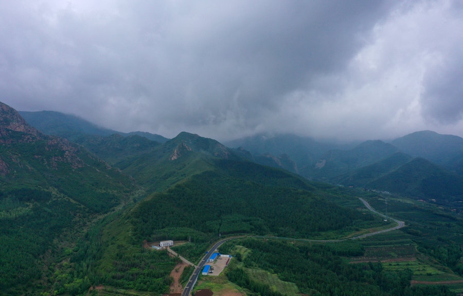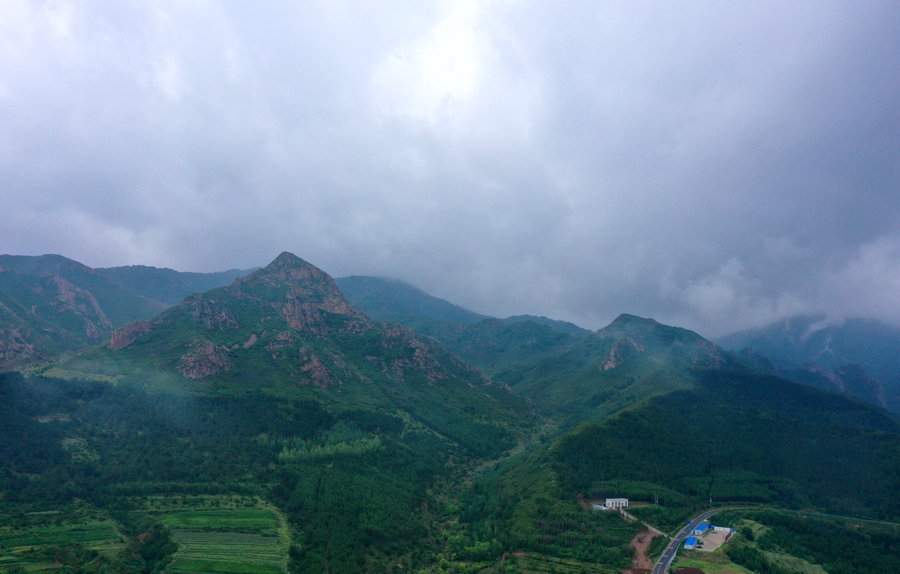 空中俯瞰細(xì)雨中的馬鞍山林場