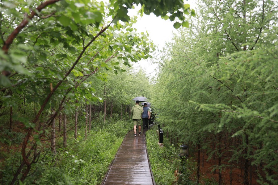 7月30日,細(xì)雨中的馬鞍山林場空氣清新,一隊(duì)游客正冒雨穿梭于林中參觀游覽。