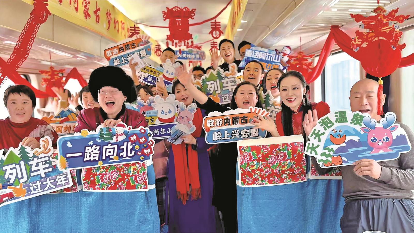 一張張貼在車窗上的“非遺”窗花剪紙,一條條紅黃藍(lán)大花座椅枕巾,一節(jié)節(jié)以藍(lán)天白云為底色的車廂頂棚,一首首悅耳的草原歌曲和悠揚(yáng)的馬頭琴聲……這個(gè)冬季,一列列由內(nèi)蒙古興安盟烏蘭浩特往返于阿爾山百年老車站的“歌游內(nèi)蒙古 夢(mèng)幻阿爾山”冰雪主題列車成為人們爭(zhēng)相體驗(yàn)的旅游產(chǎn)品。