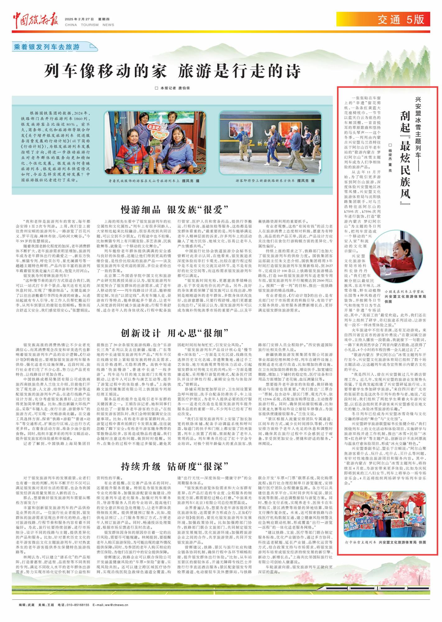 2025年2月27日,《中國(guó)旅游報(bào)》第5版刊發(fā)題為《興安盟冰雪主題列車——刮起“最炫民族風(fēng)”》的文章,報(bào)道了一列列由內(nèi)蒙古興安盟烏蘭浩特往返于阿爾山百年老車站的“歌游內(nèi)蒙古 夢(mèng)幻阿爾山”冰雪主題列車成為人們爭(zhēng)相體驗(yàn)的旅游產(chǎn)品。