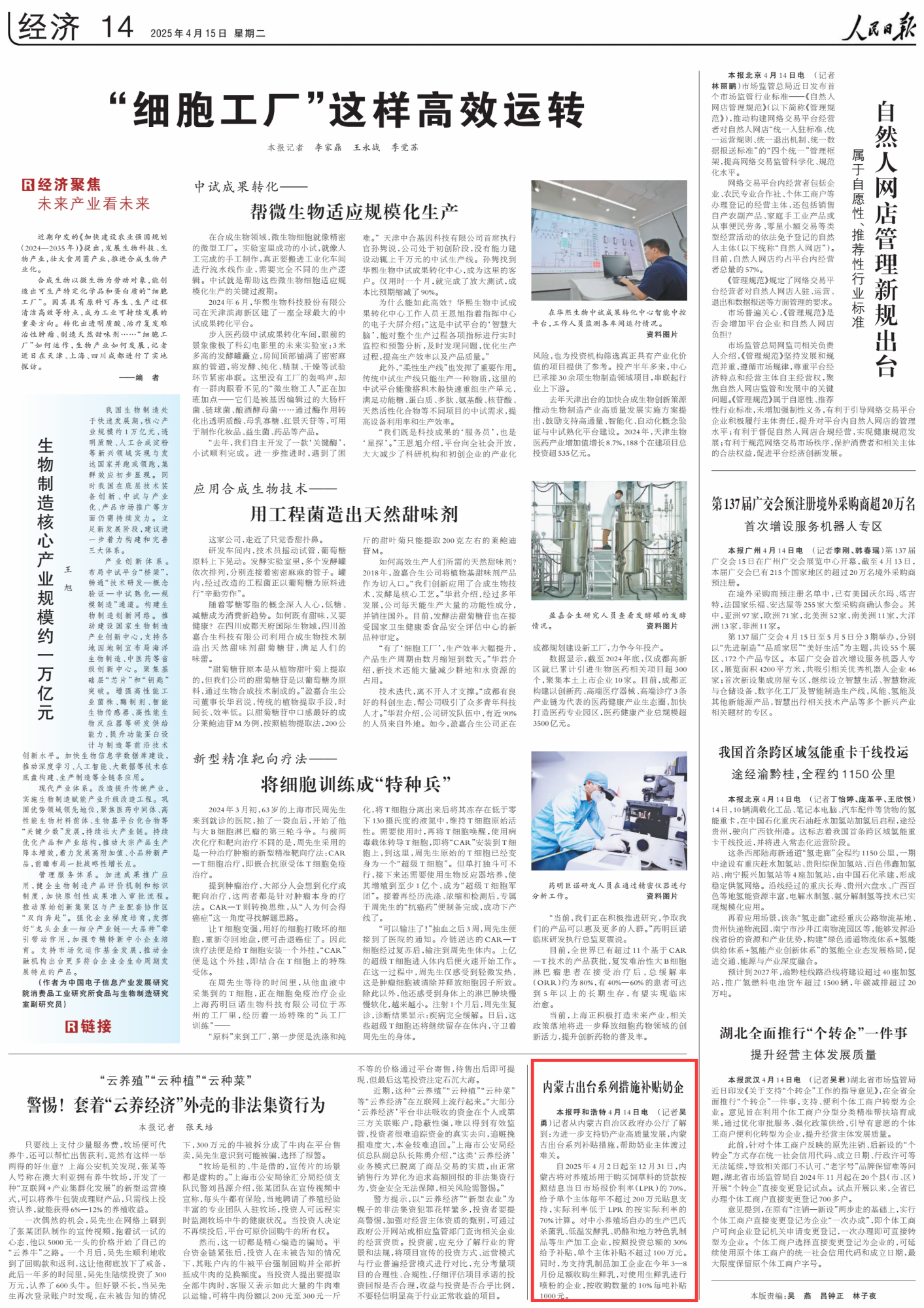 2025年4月15日,《人民日報(bào)》第14版刊發(fā)題為《內(nèi)蒙古出臺系列措施補(bǔ)貼奶企》的文章,報(bào)道了為進(jìn)一步支持奶產(chǎn)業(yè)高質(zhì)量發(fā)展,內(nèi)蒙古出臺系列補(bǔ)貼措施,幫助奶業(yè)主體渡過難關(guān)。
