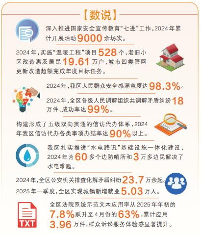 2024年,全區(qū)各級(jí)人民調(diào)解組織共調(diào)解矛盾糾紛18萬(wàn)件、成功率達(dá)99%。全區(qū)信訪代辦各類事項(xiàng)辦結(jié)率達(dá)90%以上,一大批群眾急難愁盼事項(xiàng)得到及時(shí)就地解決。