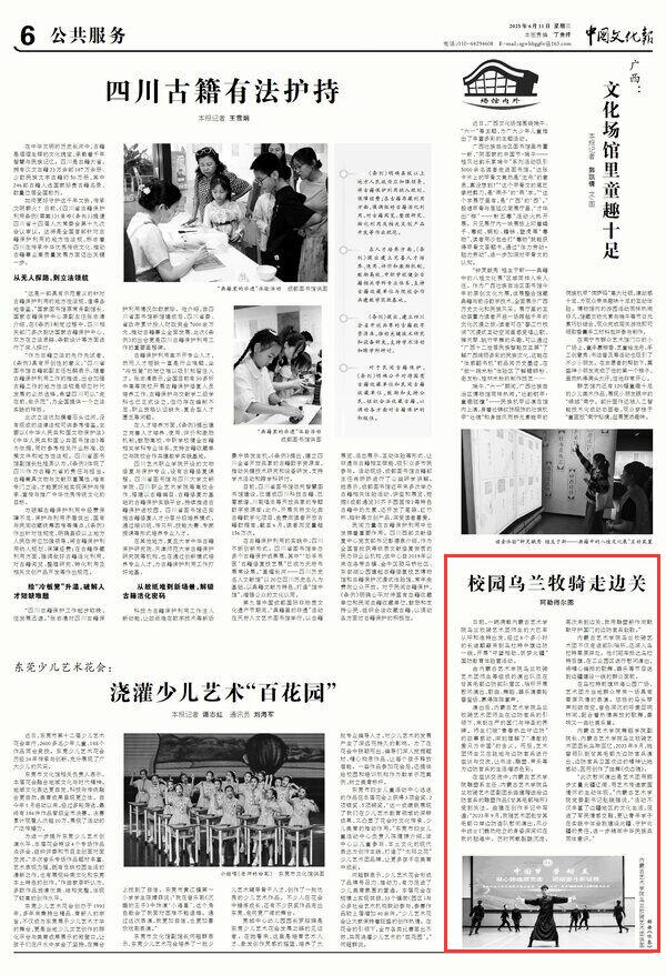 2025年6月11日,《中國文化報》第6版刊發(fā)題為《校園烏蘭牧騎走邊關(guān)》的文章,報道了內(nèi)蒙古藝術(shù)學院烏蘭牧騎藝術(shù)團師生來到烏拉特中旗邊防一線,開展慰問演出,歌曲、舞蹈、器樂演奏輪番登場,贏得陣陣掌聲。