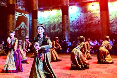 在鄂爾多斯文化產(chǎn)業(yè)園景區(qū)沉浸式劇場,演員表演實(shí)景劇《鳳鳴九曲》。新華社發(fā)