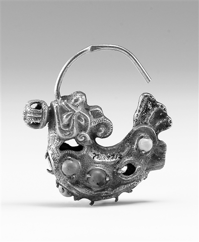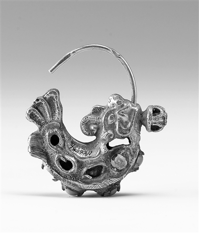 在遼代的文物遺存中,摩羯圖像廣泛見諸于各類器物上,從隨身佩戴的飾件到案頭陳設的器皿,從服飾上的精美紋樣到與宗教相關的器物,有摩羯形金耳墜、摩羯紋銀盤、摩羯紋銅鏡、摩羯紋鎏金繁花銀盞托、摩羯形白瓷燈、摩羯形注壺、摩羯紋緙絲草帽等。這些遍布于遼代各類器物上的摩羯形象,并非本土原生的文化符號,其背后承載著跨越地域的各民族交往交流交融和文化融通互鑒的歷程。