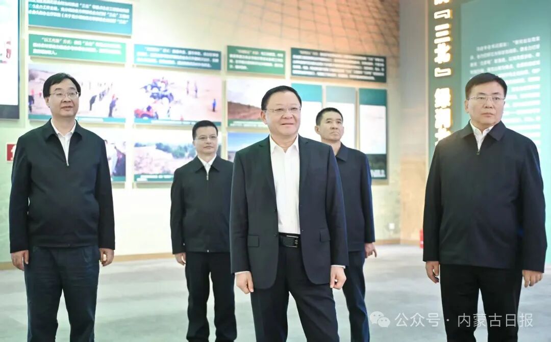 10月7日,自治區(qū)黨委書記、人大常委會黨組書記王偉中在內(nèi)蒙古展覽館參觀“綠色長城 生態(tài)奇跡——內(nèi)蒙古防沙治沙和‘三北’工程攻堅戰(zhàn)”主題展。草原云·內(nèi)蒙古新聞網(wǎng)記者馬建兵 攝