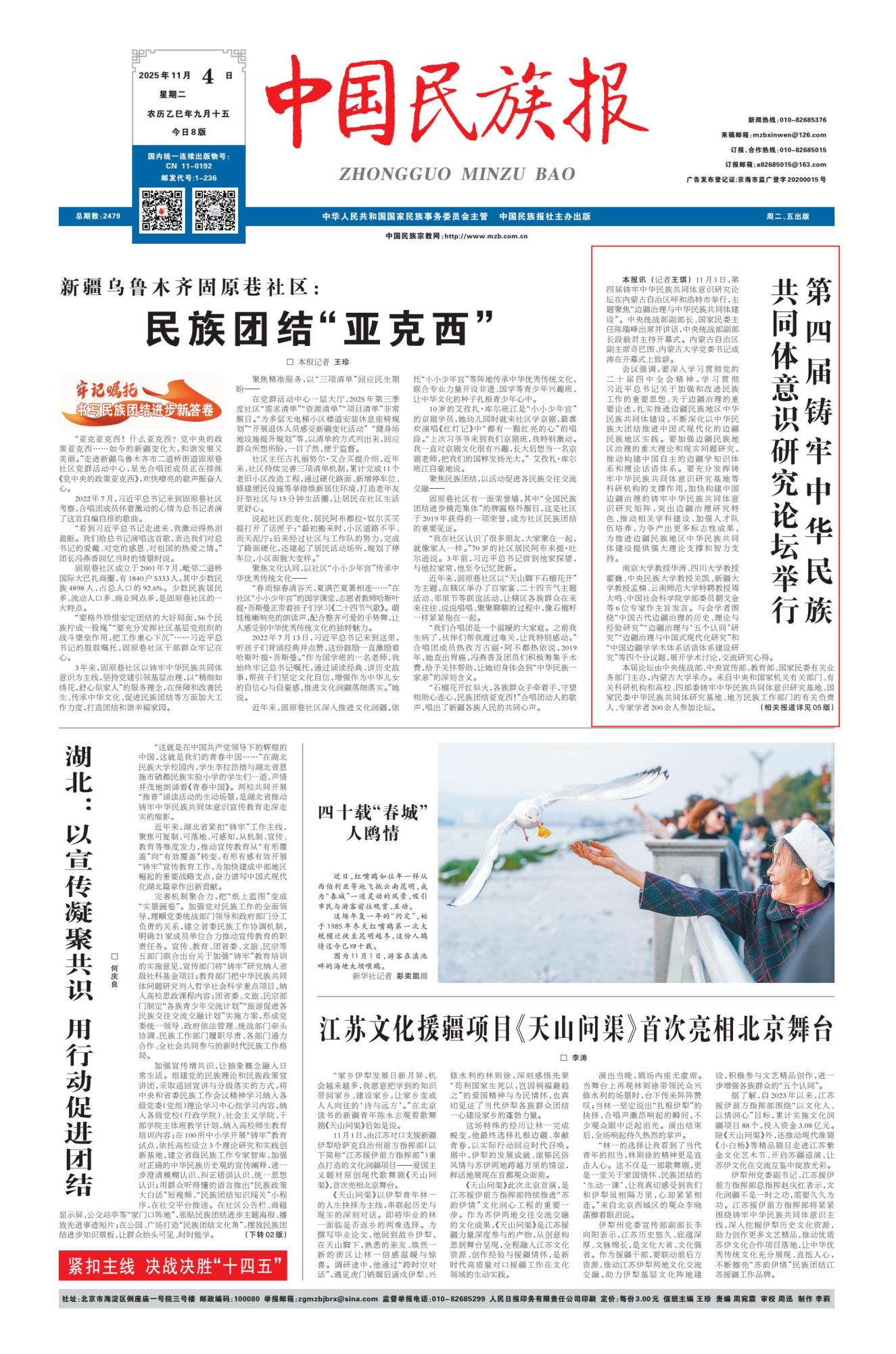 2025年11月4日,《中國(guó)民族報(bào)》頭版刊發(fā)題為《第四屆鑄牢中華民族共同體意識(shí)研究論壇舉行》的文章,報(bào)道了第四屆鑄牢中華民族共同體意識(shí)研究論壇于11月1日在內(nèi)蒙古自治區(qū)呼和浩特市舉行,主題聚焦“邊疆治理與中華民族共同體建設(shè)”。