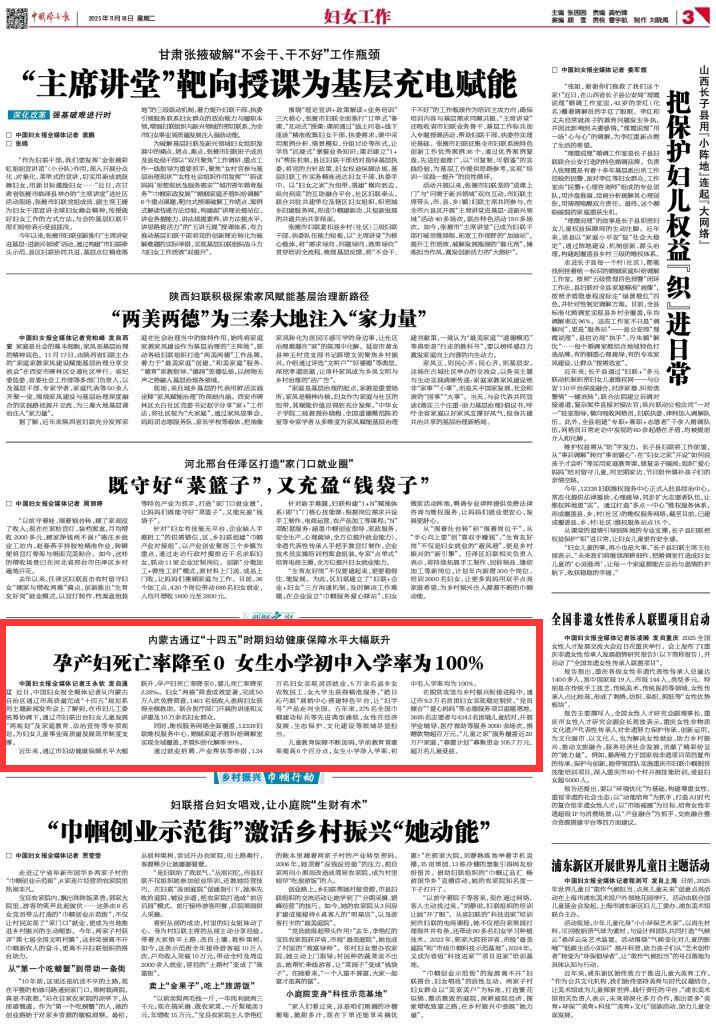 2025年11月18日《中國婦女報》第3版刊發(fā)了《內(nèi)蒙古通遼“十四五”時期婦幼健康保障水平大幅躍升 孕產(chǎn)婦死亡率降至0 女生小學(xué)初中入學(xué)率為100%》的文章,報道了近年來,通遼市婦幼健康保障水平大幅躍升,孕產(chǎn)婦死亡率降至0,嬰兒死亡率降至2.28‰。婦女“兩癌”篩查成效顯著,完成50萬人次免費(fèi)篩查,1461名低收入患病婦女獲得全額救助。聯(lián)合醫(yī)療部門開展的講座和義診惠及10萬余名婦女群眾。