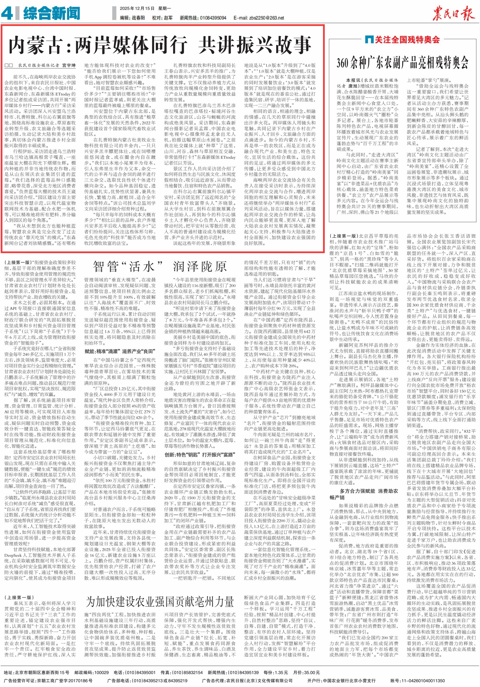 2025年12月15日《農(nóng)民日?qǐng)?bào)》第4版刊發(fā)了《內(nèi)蒙古:兩岸媒體同行 共講振興故事》的文章,報(bào)道了前不久,在海峽兩岸農(nóng)業(yè)交流協(xié)會(huì)的組織下,來自農(nóng)民日?qǐng)?bào)社、中國農(nóng)業(yè)電影電視中心、臺(tái)灣中國時(shí)報(bào)、東森新聞臺(tái)、東森新媒體ETtoday的多位記者組成采訪團(tuán),共同開展“兩岸媒體鄉(xiāng)村行——內(nèi)蒙古行”采訪采風(fēng)活動(dòng)。兩岸媒體人用鏡頭和筆觸,共同記錄下內(nèi)蒙古鄉(xiāng)村在產(chǎn)業(yè)振興、人才回鄉(xiāng)、文旅融合方面的點(diǎn)滴進(jìn)步。這份共同的見證,將通過兩岸媒體的多元傳播,讓更多受眾感受到中國北方鄉(xiāng)村蘊(yùn)含的無限活力。