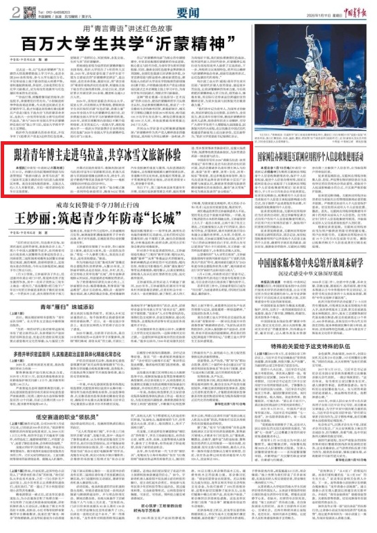 2026年1月11日,《中國(guó)青年報(bào)》第2版刊發(fā)題為《跟著青年博主走進(jìn)烏拉蓋,共享冰雪文旅新體驗(yàn)》的文章,報(bào)道了1月10日,內(nèi)蒙古自治區(qū)錫林郭勒盟烏拉蓋管理區(qū)“歌游內(nèi)蒙古 冰雪烏拉蓋”第三屆冰雪文旅主題活動(dòng)在烏拉蓋九曲灣景區(qū)開(kāi)幕。來(lái)自全國(guó)各地的游客、文旅達(dá)人約1萬(wàn)人齊聚雪原,開(kāi)啟一場(chǎng)草原特色的冬日文旅盛宴。