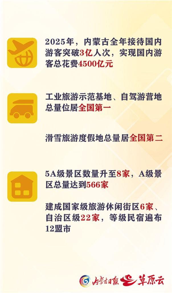 數(shù)據(jù)說話,最有分量。2025年,內蒙古全年接待國內游客突破3億人次,實現(xiàn)國內游客總花費4500億元。