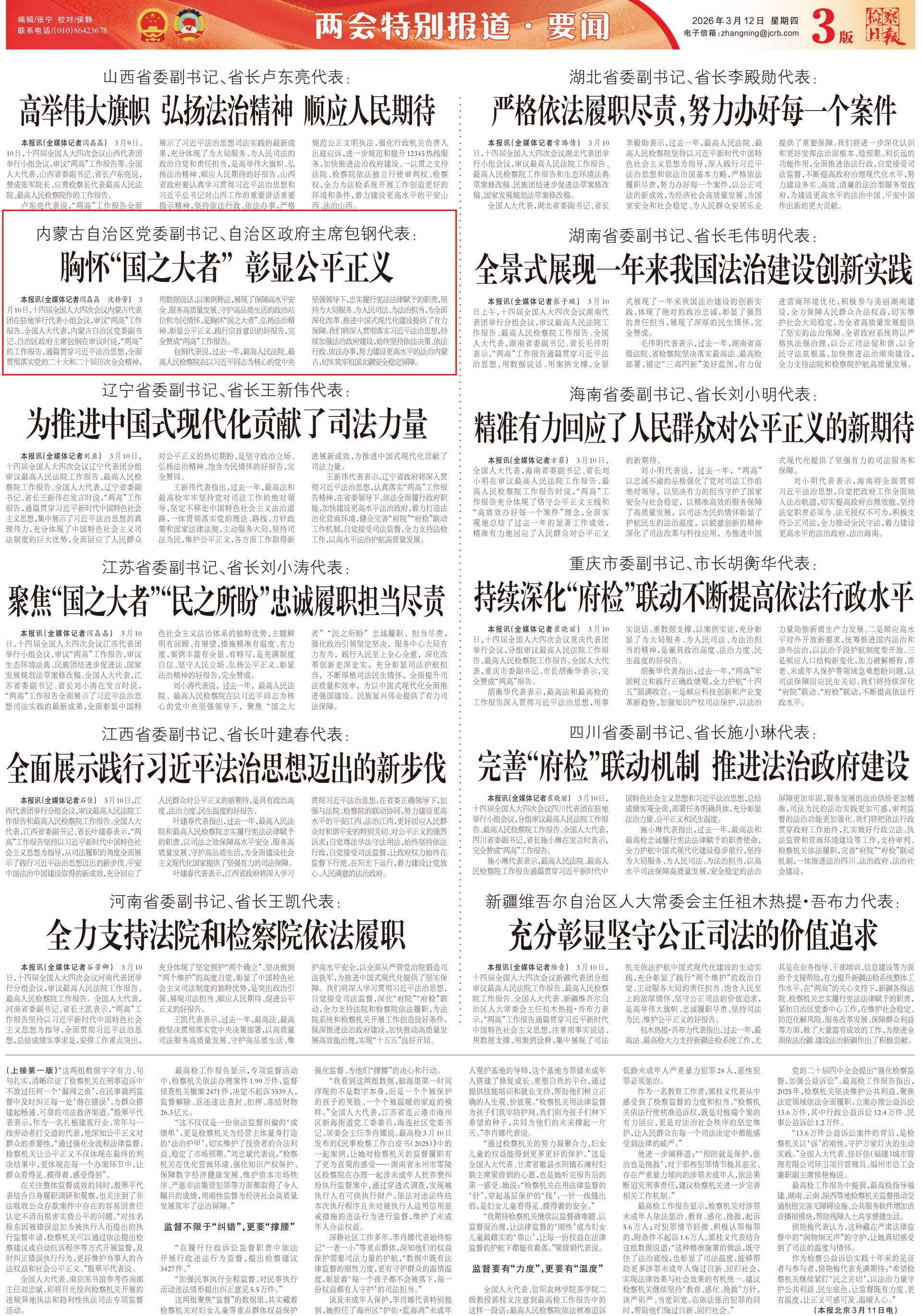2026年3月11日《檢察日報》第3版刊發(fā)了《內(nèi)蒙古自治區(qū)黨委副書記、自治區(qū)政府主席包鋼代表: 胸懷“國之大者” 彰顯公平正義 》的文章,報道了十四屆全國人大四次會議內(nèi)蒙古代表團在駐地舉行代表小組會議,審議“兩高”工作報告。全國人大代表,內(nèi)蒙古自治區(qū)黨委副書記、自治區(qū)政府主席包鋼在審議時說,“兩高”的工作報告,通篇貫穿習近平法治思想,全面貫徹落實黨的二十大和二十屆歷次全會精神,用數(shù)據(jù)說話,以案例釋法,展現(xiàn)了保障高水平安全、服務高質(zhì)量發(fā)展、守護高品質(zhì)生活的政治站位和為民情懷,是胸懷“國之大者”、弘揚法治精神、彰顯公平正義、踐行宗旨意識的好報告,完全贊成“兩高”工作報告。