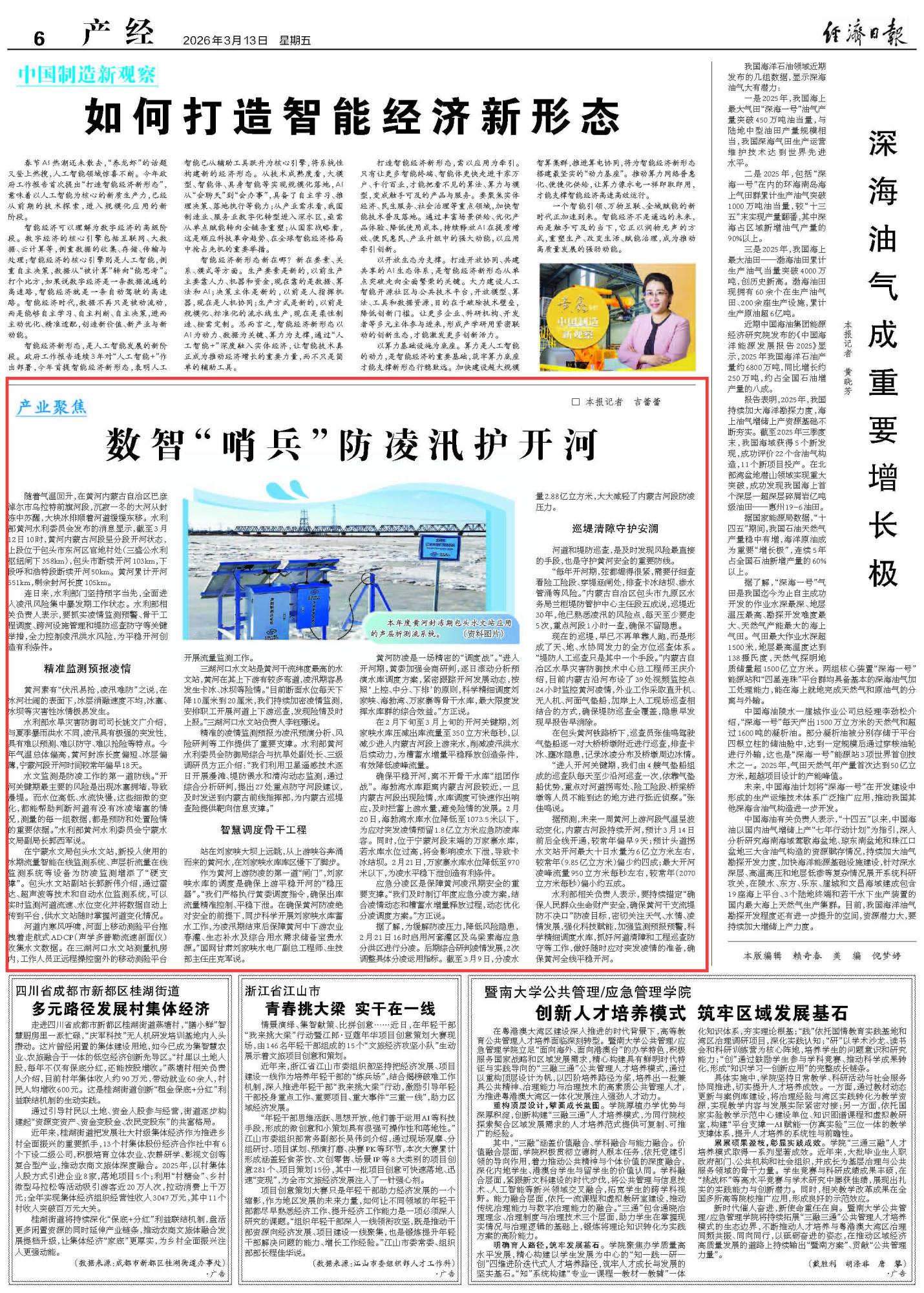 2026年3月13日《經(jīng)濟日報》第6版刊發(fā)了《數(shù)智“哨兵”防凌汛護開河》的文章,報道了3 月 12 日,黃河內(nèi)蒙古河段呈分段開河狀態(tài),累計開河 551 公里,剩余封河 105 公里。今年寧蒙河段開河偏早,凌汛風險突出,水利部門通過精準監(jiān)測預(yù)報、智慧調(diào)度骨干水庫、啟用應(yīng)急分洪區(qū)、開展全方位巡堤清障等舉措,全力保障開河平穩(wěn)。預(yù)計 3 月 14 日前后內(nèi)蒙古河段全線開通,各項防凌工作正有序推進。