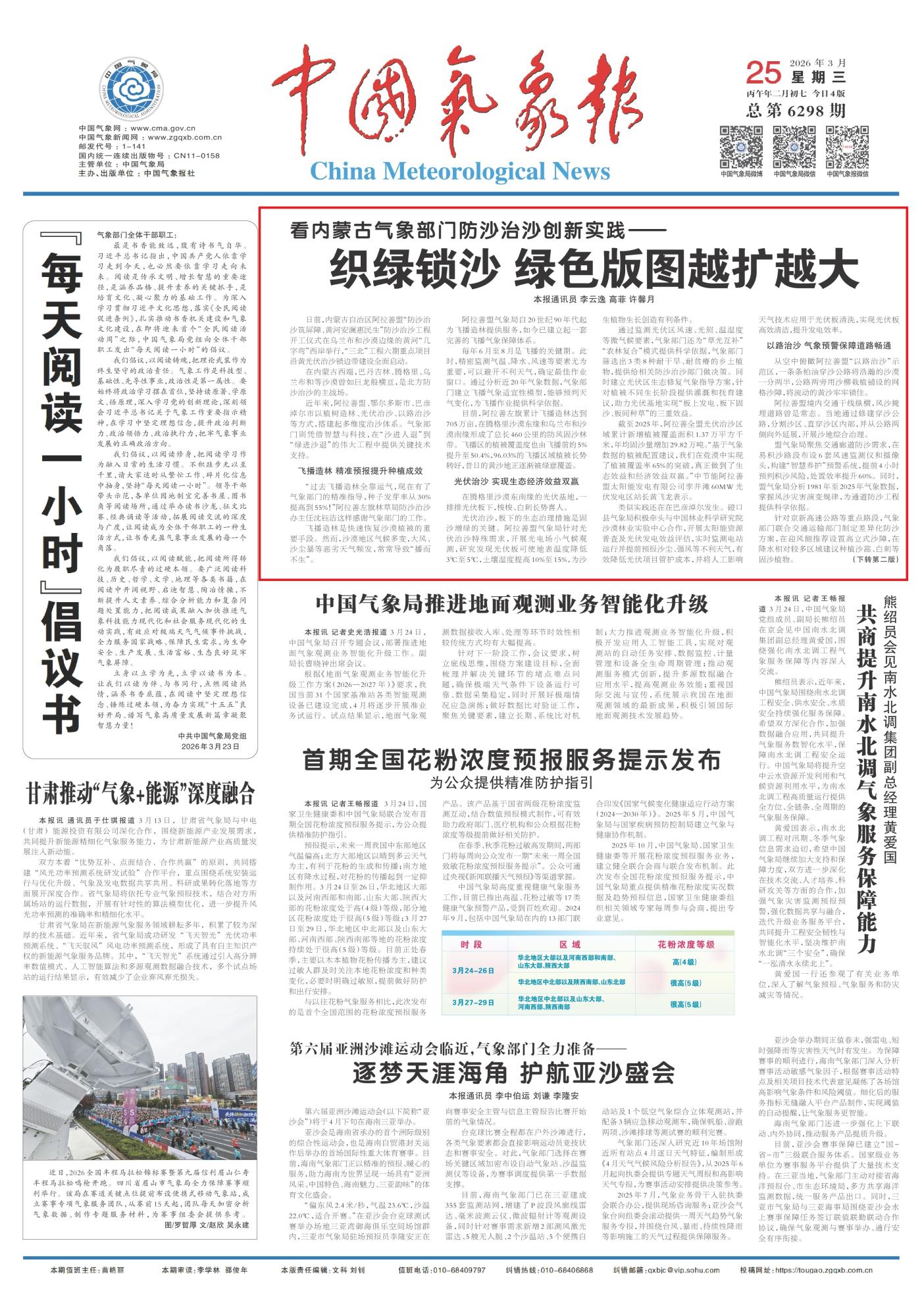 2026年3月25日《中國氣象報》第1版刊發(fā)了《看內(nèi)蒙古氣象部門防沙治沙創(chuàng)新實踐—織綠鎖沙綠色版圖越擴越大》的文章,報道了內(nèi)蒙古阿拉善盟啟動沿黃光伏治沙等“三北”六期防沙治沙重點工程,氣象部門精準(zhǔn)賦能飛播造林、光伏治沙、以路治沙三大模式,提供全流程技術(shù)支撐,大幅提升治沙成效與生態(tài)經(jīng)濟(jì)效益,筑牢北方生態(tài)安全屏障。