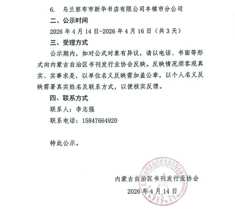 公示期內(nèi),如對(duì)公式對(duì)象有異議,請(qǐng)以電話、書面等形式向內(nèi)蒙古自治區(qū)書刊發(fā)行業(yè)協(xié)會(huì)反映。反映情況須客觀真實(shí)、實(shí)事求是,以單位名義反映需加蓋公章,以個(gè)人名義反映需署真實(shí)姓名及聯(lián)系方式,以便核實(shí)反饋。