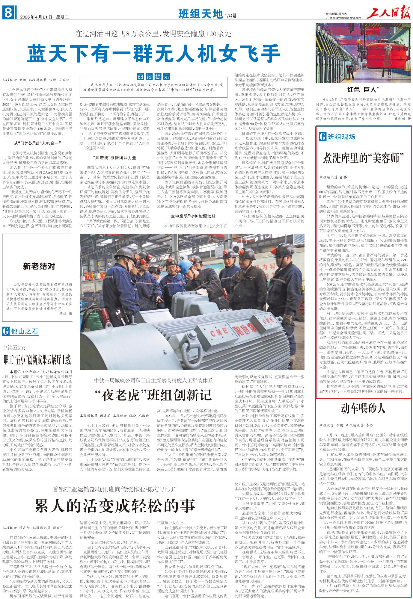2026年4月21日,《工人日報》第8版刊發(fā)題為《煮洗庫里的“美容師”》的文章,報道了53歲的朱運(yùn)達(dá),是中國鐵路呼和浩特局集團(tuán)有限公司大板機(jī)務(wù)段的煮洗工,煮洗工們從不曾出現(xiàn)在旅客的視野中,但這群幕后“美容師”,一直在默默守護(hù)鋼鐵巨龍的每一趟馳騁。