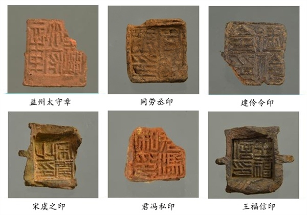 封泥集中出土于北部發(fā)掘區(qū)東北角的河道廢棄堆積中,共計(jì)837枚。主要為官印封泥和私印封泥,其中官印封泥有“益州太守章”“建伶令印”“同勞示印”等,涵蓋了漢代益州郡 24 縣中的20個縣名。出土帶字簡牘殘片 1000 余枚,不帶字的簡牘殘片近萬枚。其中,帶字簡牘中釋讀出“滇池以亭行”“建伶”“始元四年”等文字,應(yīng)是公文文書。