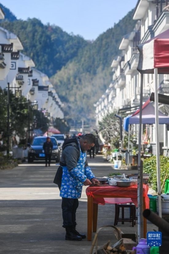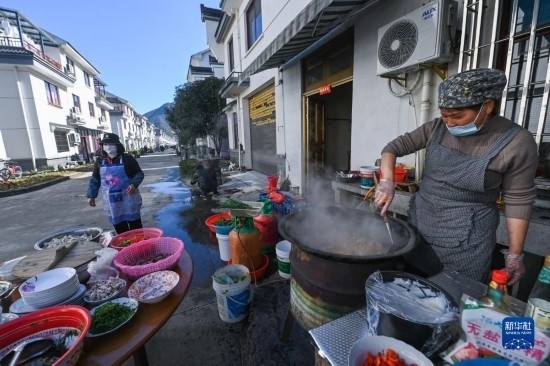 2月26日,蓮花鎮(zhèn)戴家新村的村民在新居門前烹飪農家菜,為百家宴做準備。