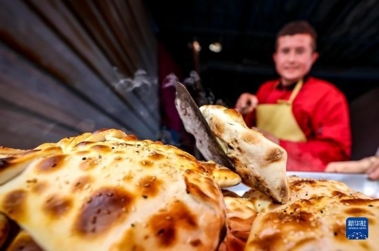 2月26日,在托克扎克鎮(zhèn)農(nóng)貿(mào)市場,名為“庫麥其”的當(dāng)?shù)貍鹘y(tǒng)面食剛剛出爐。