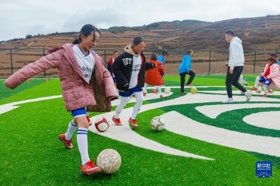 圖為在“玫瑰夢想球場”上,瓦吾小學(xué)的女足隊(duì)員們在教練曹國棟(前)的帶領(lǐng)下訓(xùn)練(2023年3月3日攝)。