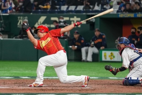 3月9日,中國隊(duì)選手梁培慶祝打出本壘打。新華社記者 張笑宇 攝