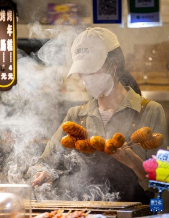 5月2日,商戶在寧夏銀川市金鳳區(qū)閱彩城中街制作特色美食。
