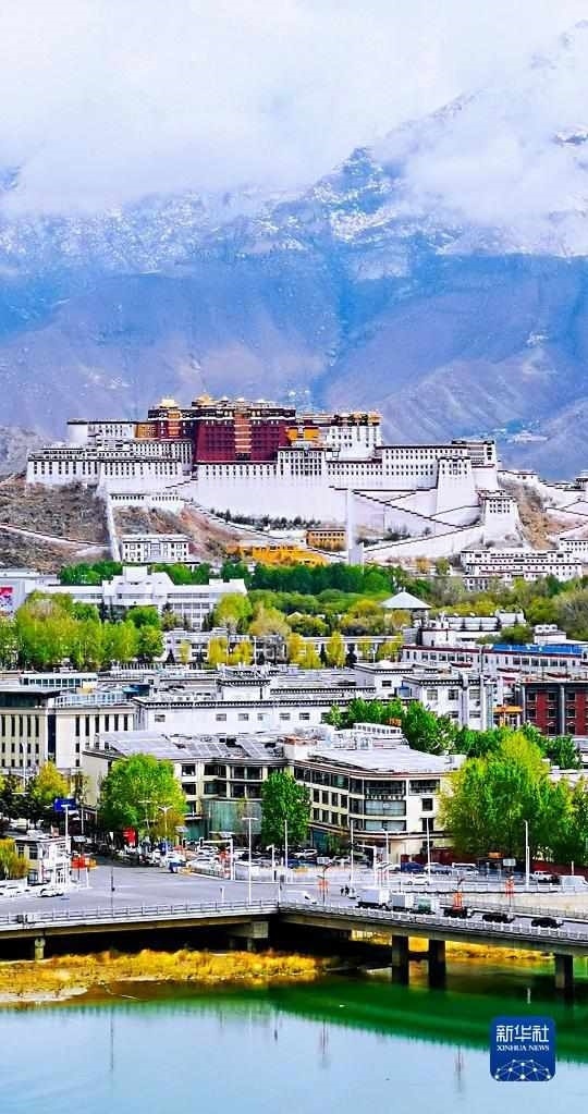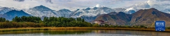 這是在拉魯濕地拍攝的拉薩風光,蔥蘢的樹木點綴在城市中,與山色相映成趣(5月12日攝)。