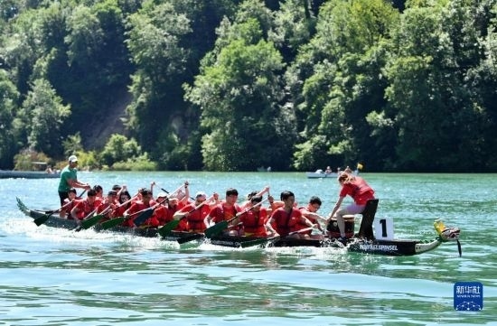 6月25日,在瑞士埃格利紹,瑞士蘇黎世州華僑華人組織的“龍戰(zhàn)隊”參加賽龍舟活動。