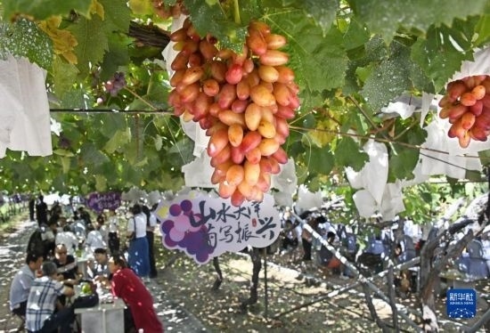 9月9日,市民和游客在山東省平度市大澤山鎮(zhèn)葡萄大觀園內休閑游玩。