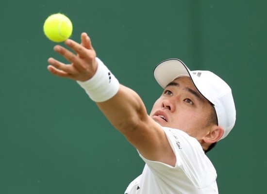7月5日,吳易昺在比賽中發(fā)球。新華社記者 李穎 攝