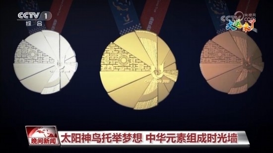 再來看圖案。獎牌正面設(shè)計賦予“太陽神鳥”羽翼幾何感,與賽會會徽“U”呼應(yīng),猶如神鳥振翅欲飛,寓意守護夢想,自信昂揚,飛往多彩未來。同時,在幾何扇面嵌入一塊包含多種中華文明代表元素為底紋的絢麗時光墻,以呈現(xiàn)中國五千年文明的璀璨輝煌和演變歷史。