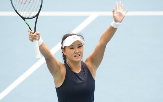 8月6日,中國隊選手郭涵煜在獲得網球女單冠軍后慶祝勝利。新華社記者 江宏景 攝