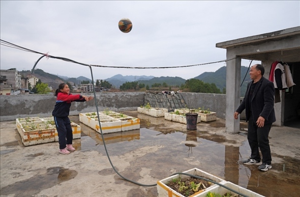 3月27日,李文文在屋頂露臺(tái)和父親玩投籃游戲。李文文是貴州臺(tái)江縣臺(tái)盤(pán)鄉(xiāng)中心小學(xué)的女籃隊(duì)長(zhǎng),以前他的父親在外地務(wù)工,如今火爆全網(wǎng)的“美麗鄉(xiāng)村”籃球聯(lián)賽給臺(tái)盤(pán)鄉(xiāng)帶來(lái)了人氣,父親在家門(mén)口就能找到工作。